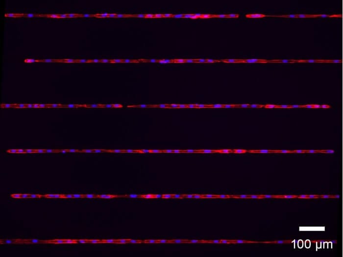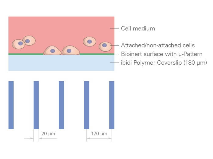利用ibidi的µ-Patterns技術(shù),可從細(xì)胞懸液中創(chuàng)建線性陳列的圖案,引導(dǎo)細(xì)胞沿一維(1D)微通道特異性附著和生長。