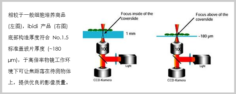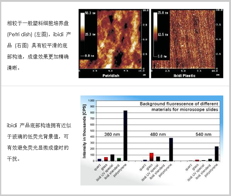 由德國 ibidi 公司所研發的 µ-Slide 與 µ-Dish 系列產品,與一般市面上常見的細胞培養器皿不同,其底部是由獨特的塑料所制造,具有可比擬玻璃材質的高光學穿透與低熒光背景值特性,因此除了可適用于細胞培養以外,還可在顯微鏡下呈現出非常清晰漂亮的細胞影像。